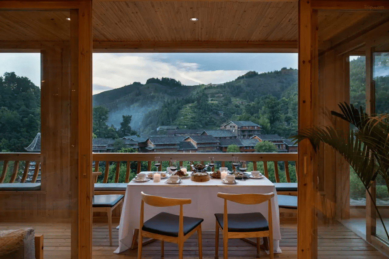The hotel offers a variety of modern and well-equipped rooms and suites, many with stunning views of the surrounding Dong village. Options include Ping’an Rooms with panoramic bathtubs and 180° village views, Leisure Dong Village View Twin Rooms, and Happy Rooms with balconies and private hot springs. Rooms are equipped with Dyson hairdryers and smart toilets, as well as free Wi-Fi.