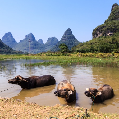 In the evening, you can enjoy the sound and light show “Liu San Jie”, based on a very popular Chinese musical, directed by Chinese filmmaker Zhang Yimou. It takes place on the Li River in a beautiful natural setting surrounded by karstic mountains (not included in the quote: 280RMB / pers B2 comfort spot with transport). Overnight in Yangshuo.