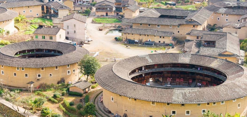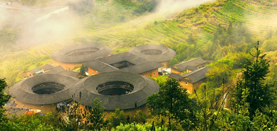 The Tianluokeng Tulou is located in the beautiful village of Shangban, this fortress village consists of four round houses and a rectangular earthen house. It is one of the best preserved ensembles in the region. The village is listed in the list of the most beautiful historical cultural villages of China, and the World Heritage of Humanity by UNESCO.During the cold war, in the satellite photos, the four huge Tianluokeng round buildings were identified by the CIA as possible nuclear missile silos!