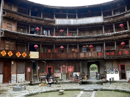 The village Hakka of Taxia is located in the Shuyang Valley. There are more than 20 earthen constructions, of different shapes, built along the shore of a small river. On the outskirts of the village is also the Hall of ancestors Zhang with its 20 stone pillars made in homage to the dignitaries of the village.