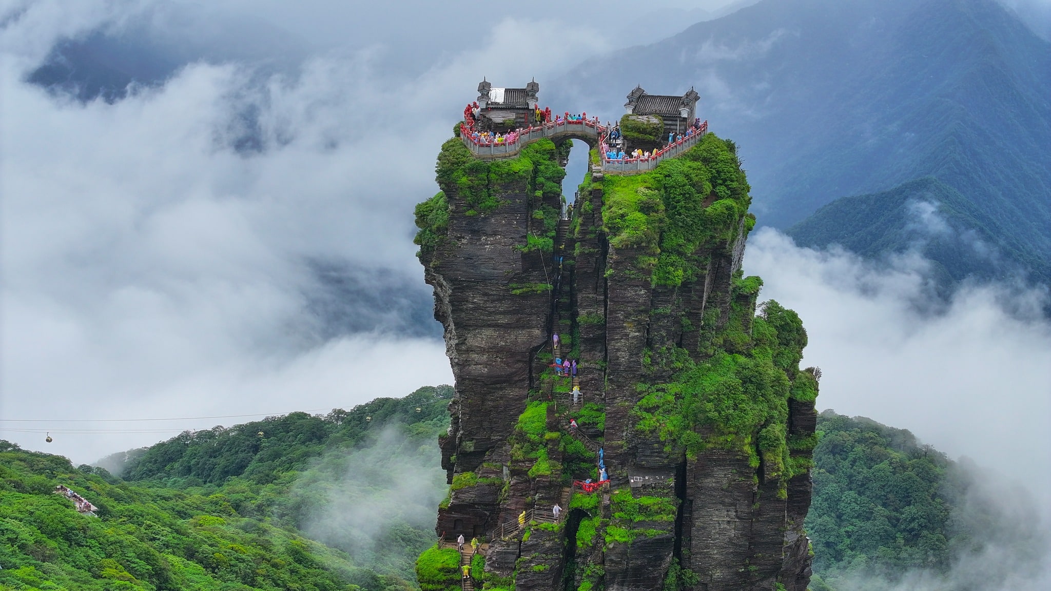 The mountain holds great significance in Chinese Buddhism. Two iconic temples, the Buddha Temple and Maitreya Temple, stand atop the dramatic Red Cloud Golden Summit, separated by a deep gorge crossed by a stone bridge. Pilgrims and visitors reach the summit by cable car and a hike, rewarded with breathtaking views, rolling seas of clouds, sunrises, and the rare “Buddha halo” optical phenomenon. The Mushroom Rock is another famous landmark for photography enthusiasts.