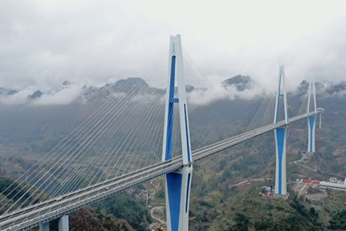 Guizhou is known as the province in China with the most high-rise bridges than any other region in the world. Here is its latest creation, the Pingtang Bridge, a giant 2,135-meter-long viaduct that has been open to traffic since December 2019… Located in Pingtang, the bridge spans the Caodu River Valley at a height of abPingtang Bridge – Guizhou Province – China Roadsout 300 meters. It has 2 cable-stayed spans supported by 3 towers, the highest of which is 332 meters high.