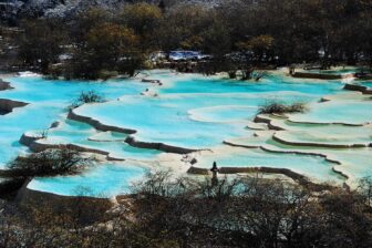 Drive to Huanglong (2 hours). Discovery of Huanglong National Park, composed of impressive karst formations. Surface calcification is the main landscape of the Huanglong Valley, with thousands of pools and calcified banks resembling a golden dragon flying out of the forest. Enclosing dikes form various pools; snowmelt flows along the calcified tiers like terraced fields or fish scales. The water colors shift depending on the sediment, trees, and mountains, appearing yellow, green, light blue, azure, etc. Ascend by cable car, followed by a 50-minute walk to arrive at the Five-Colored Lake at 3,550 meters altitude. Then, allow about 2.5 hours of normal walking through a small but sumptuous valley with its terraced limestone pools to tour the area and descend to the bus without the cable car, in order to admire the landscape. Transfer to Huanglong-Jiuzhai Station, departure by high-speed train C5768 (17:59–19:52) to Chengdu. Arrival at Chengdu East Station, greeting by your driver, and transfer to the hotel. Overnight: Wenjun Courtyard.