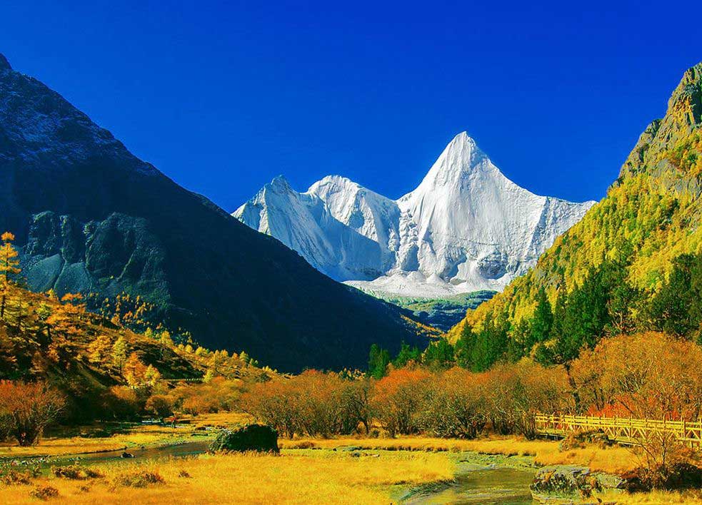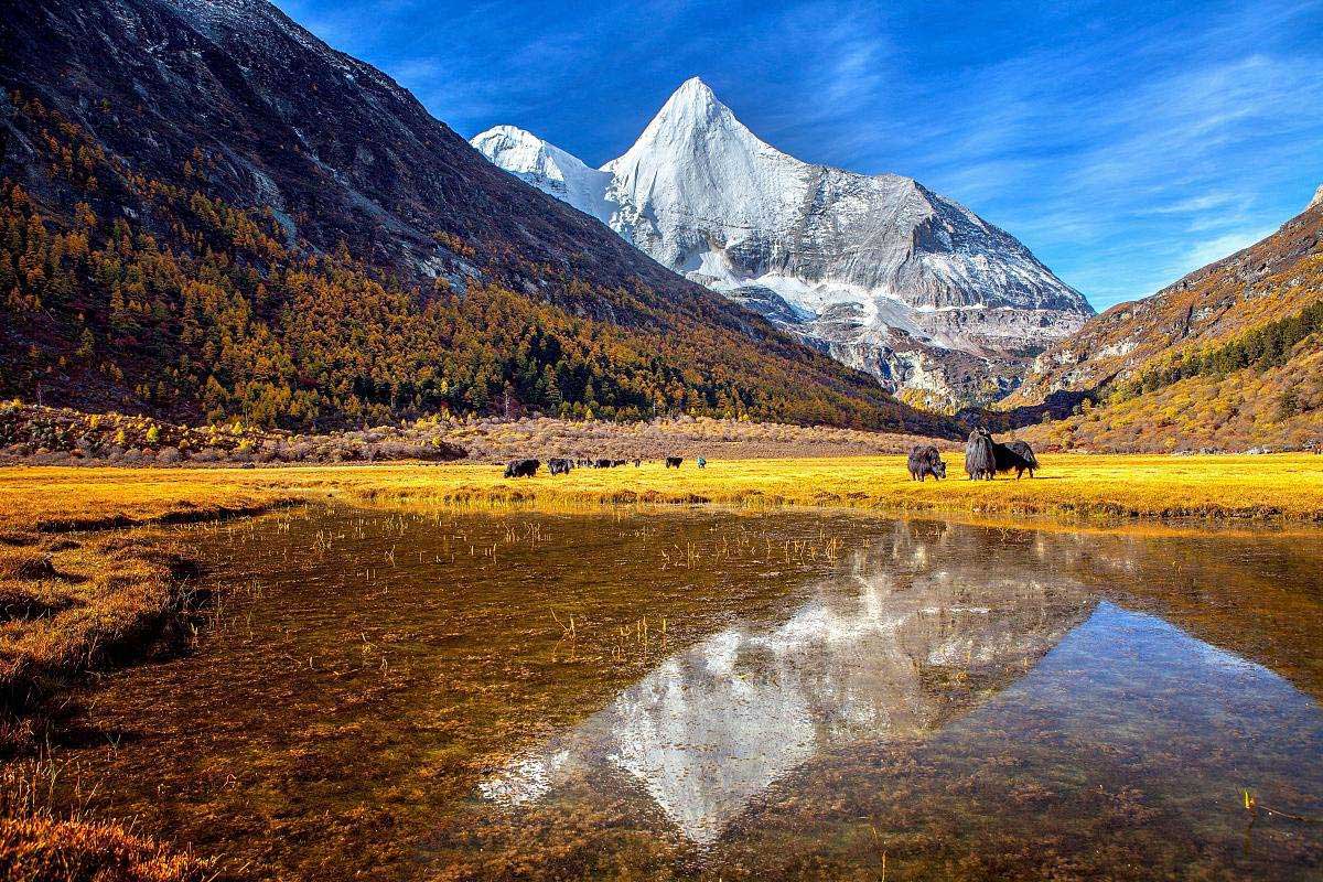 At the crossroads of northern Yunnan and the vast highland meadows of kham, Daocheng Valley offers landscapes of gentle hills covered with small Tibetan hamlets and wheat crops where villagers and peaceful yaks are busy.The surrounding area of this small town offers several other sites of interest: the hot springs, the Maji temple, the river to the north of the city and the surrounding countryside.The Yading Reserve, not really known by foreign visitors, has remained in a preserved natural setting because traffic and buildings are very controlled. Depending on your tastes, you can go on horseback or on foot, in one or more days.Lakes and meadows surrounded by peaks blooming with 6000 meters constitute a majestic landscape inviting humility (and unforgettable trekking!). Chenrezig (6032m), Jambeyag (5958m) and Chanadorje (5958m). A trek / pilgrimage around the Chenrezig is possible.Ticket price: About 130 yuan / personAccess: Possible visit from April to October. Bus from Zhongdian, Litang, Kangding and Chengdu.