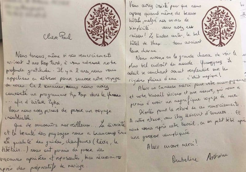 Even though our thanks come two years too late, we want to express our deep gratitude. Two years ago, we called you in distress to save our honeymoon. In two weeks, you had put together a top-notch program for us in Yunnan… to avoid Zyka.